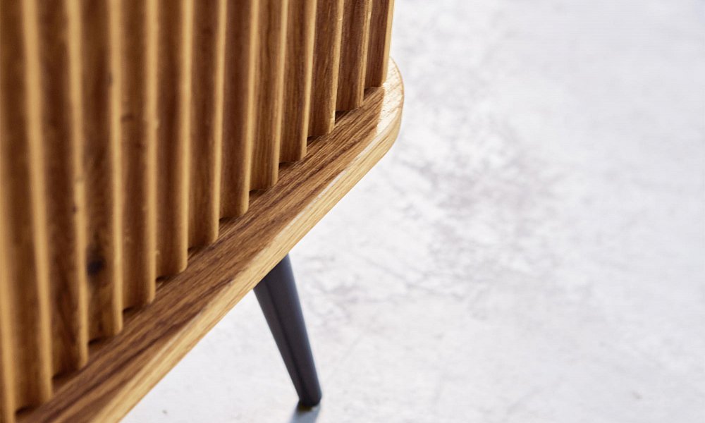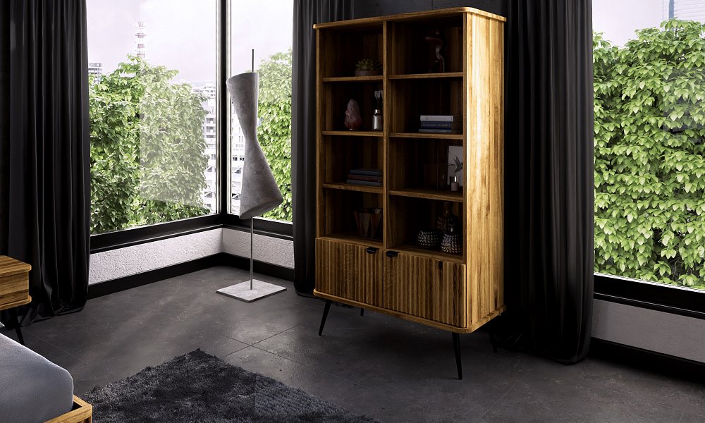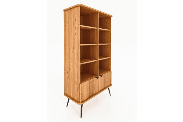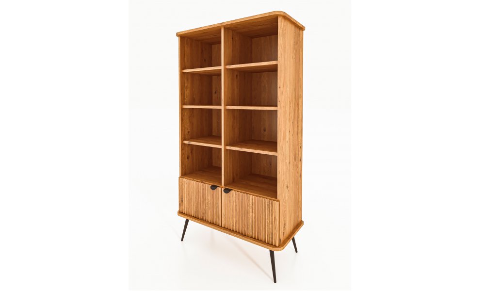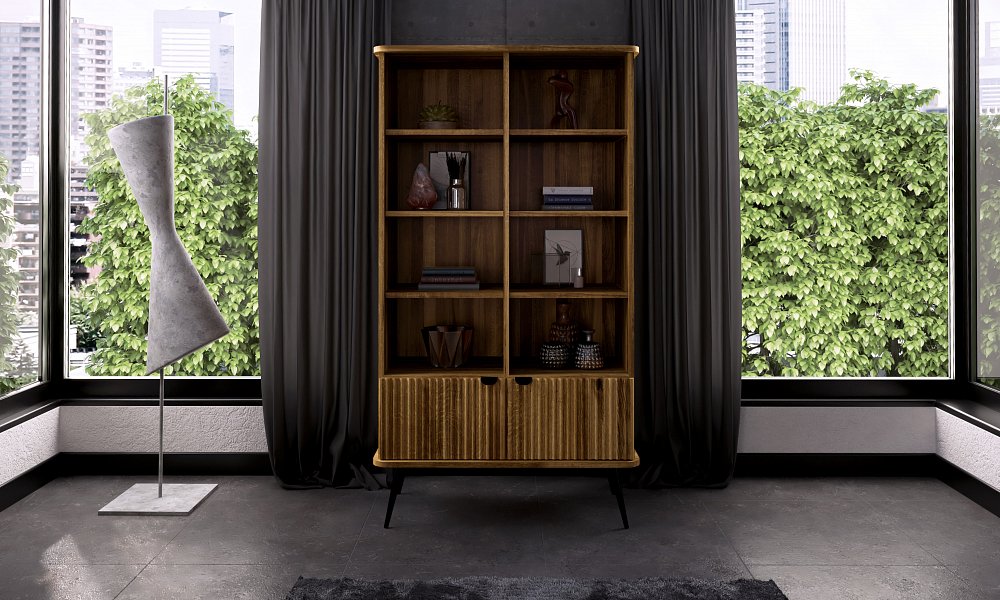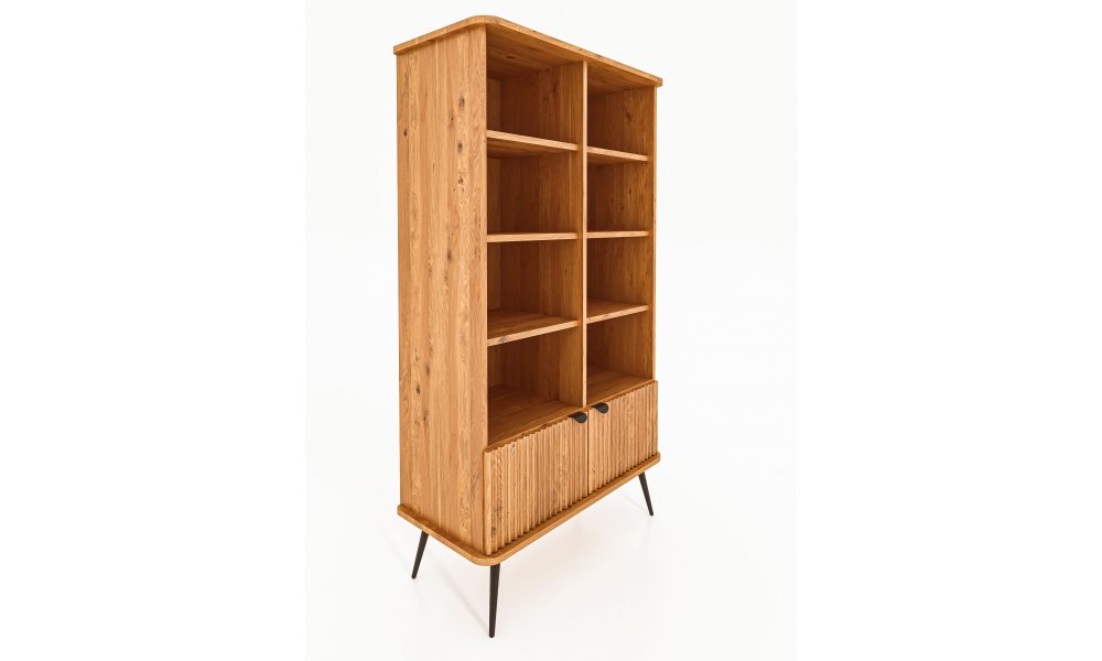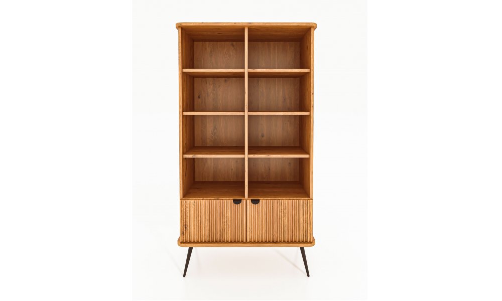 Dies ist das grösste und zugleich praktischste Möbelstück dieser Kollektion. Dank der schlanken, schwarzen Beine wirkt das Regal dennoch leicht und elegant. Es bietet reichlich Platz für Bücher, Dokumente, Dekorationen oder Bilderrahmen. Ideal für das Wohnzimmer, aber auch perfekt für das Arbeitszimmer. Hier gehen Funktionalität und Eleganz Hand in Hand – die gerillten Fronten verleihen dem Möbelstück einen einzigartigen und stilvollen Charakter.