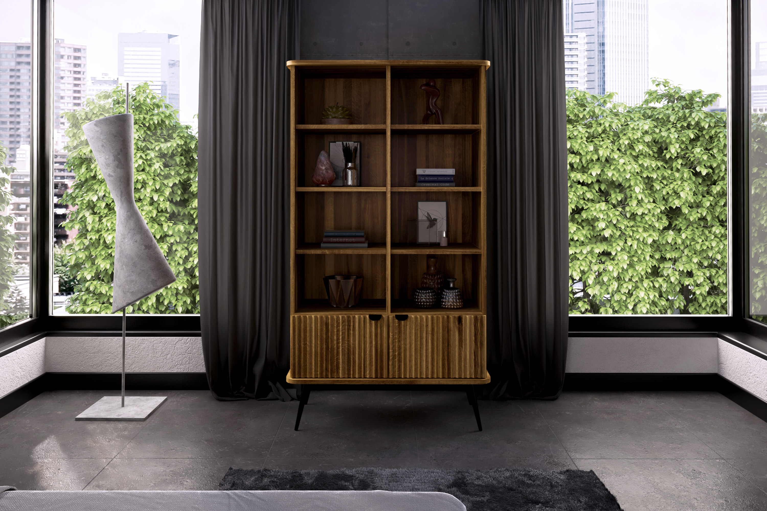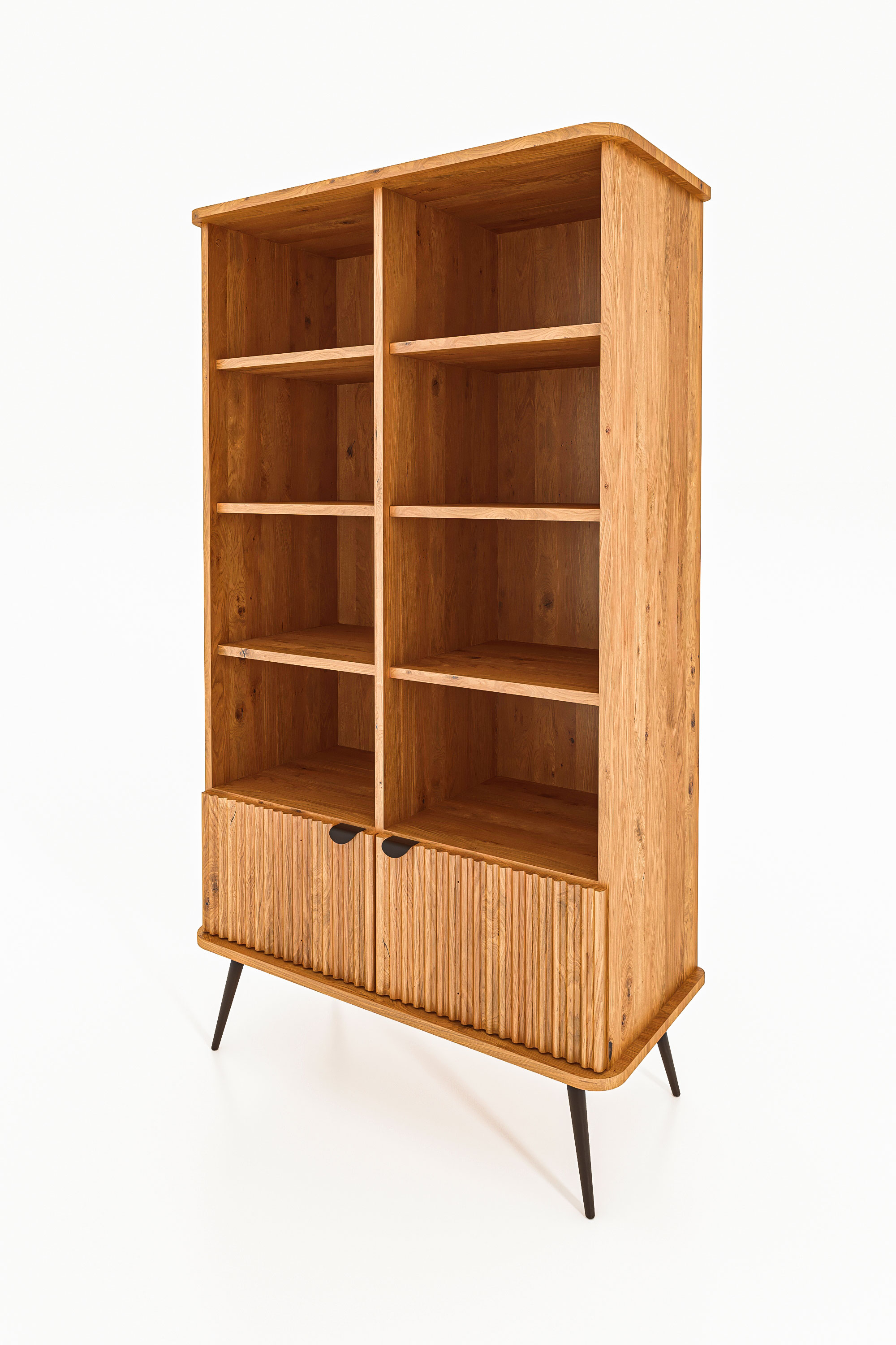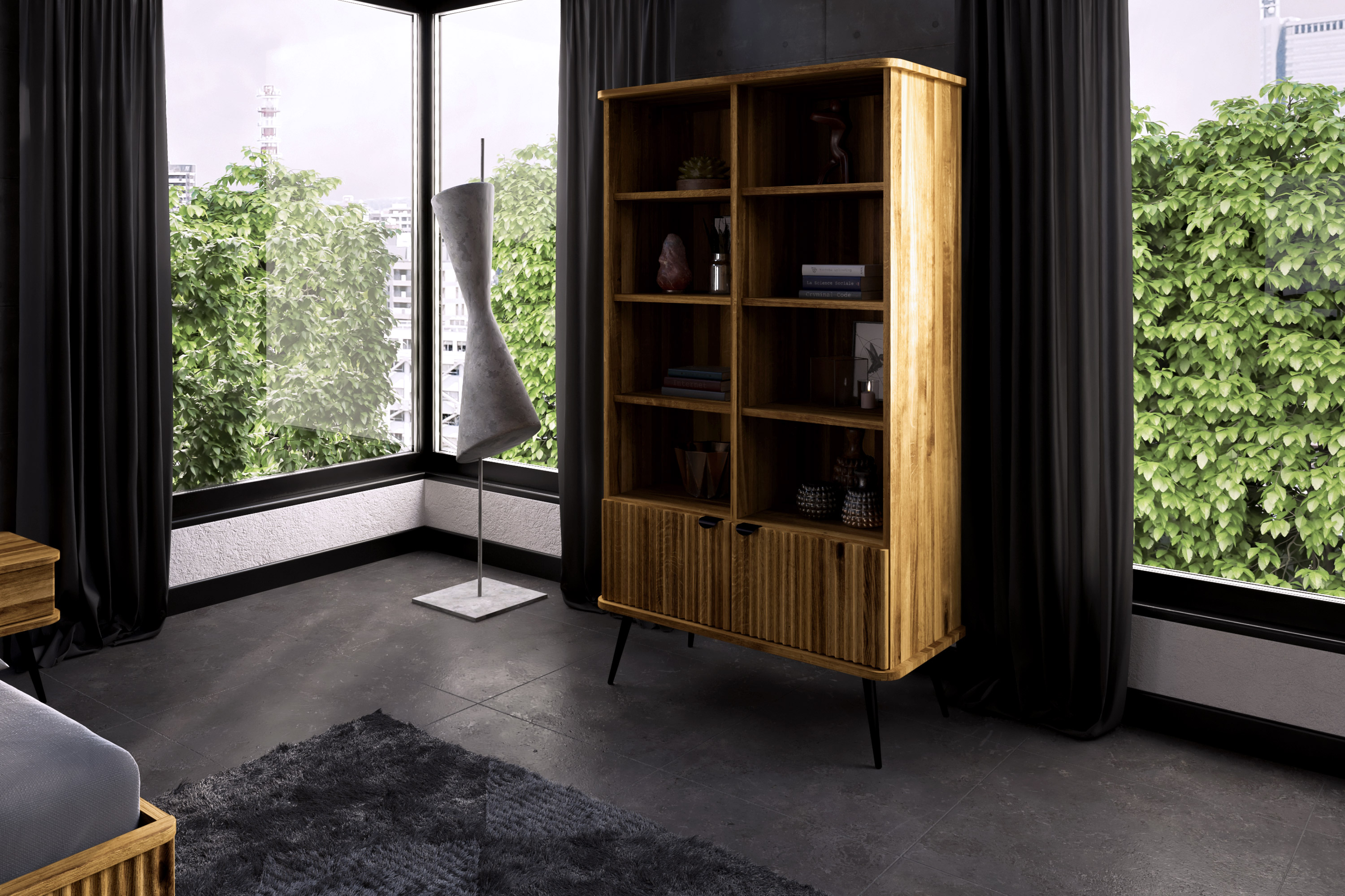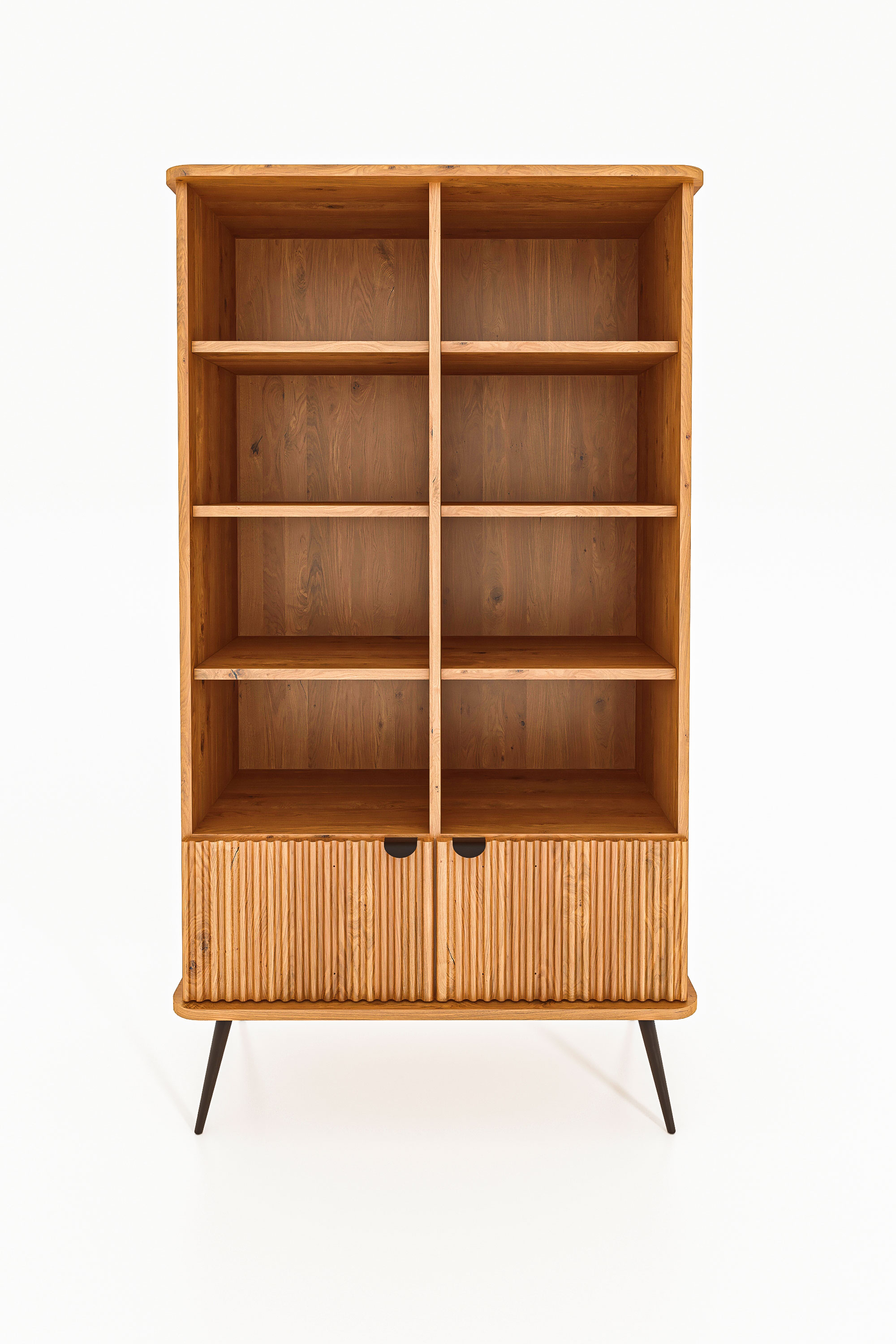 Dies ist das grösste und zugleich praktischste Möbelstück dieser Kollektion. Dank der schlanken, schwarzen Beine wirkt das Regal dennoch leicht und elegant. Es bietet reichlich Platz für Bücher, Dokumente, Dekorationen oder Bilderrahmen. Ideal für das Wohnzimmer, aber auch perfekt für das Arbeitszimmer. Hier gehen Funktionalität und Eleganz Hand in Hand – die gerillten Fronten verleihen dem Möbelstück einen einzigartigen und stilvollen Charakter.