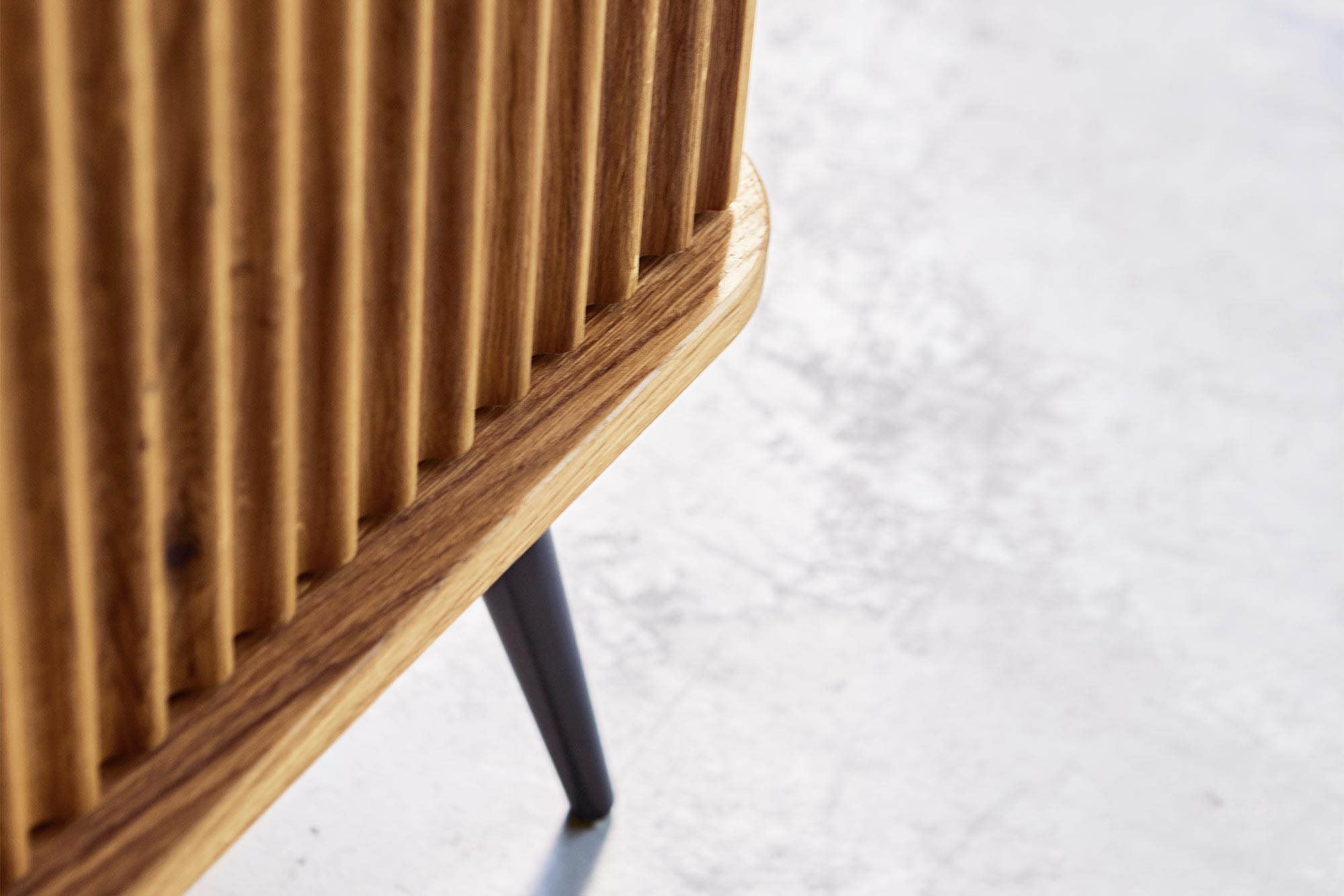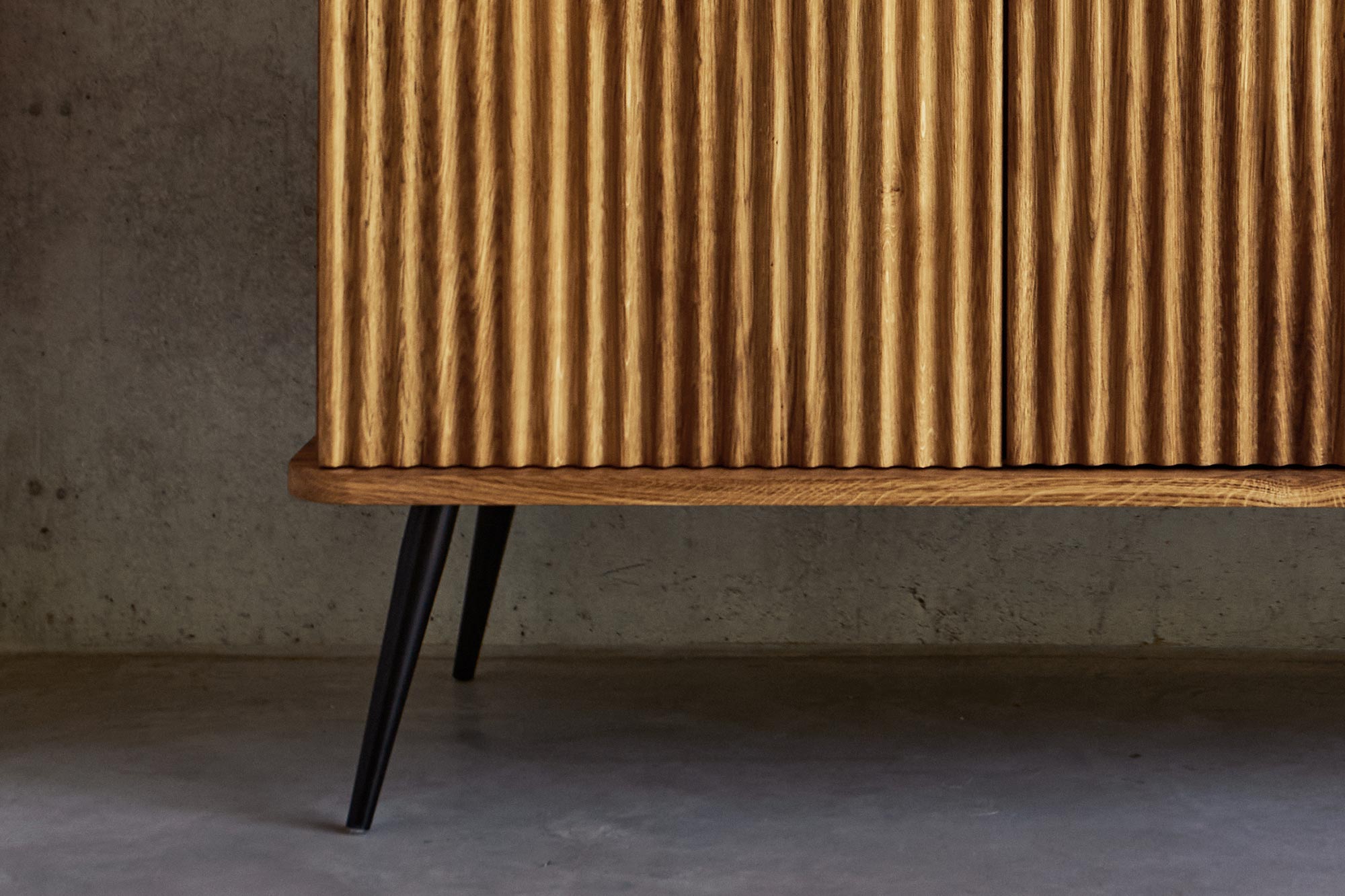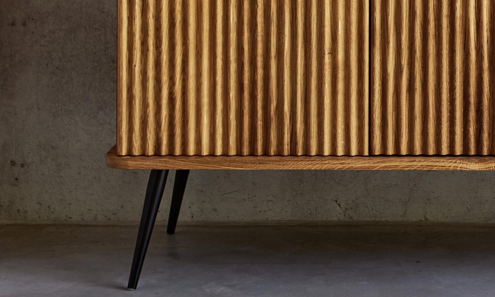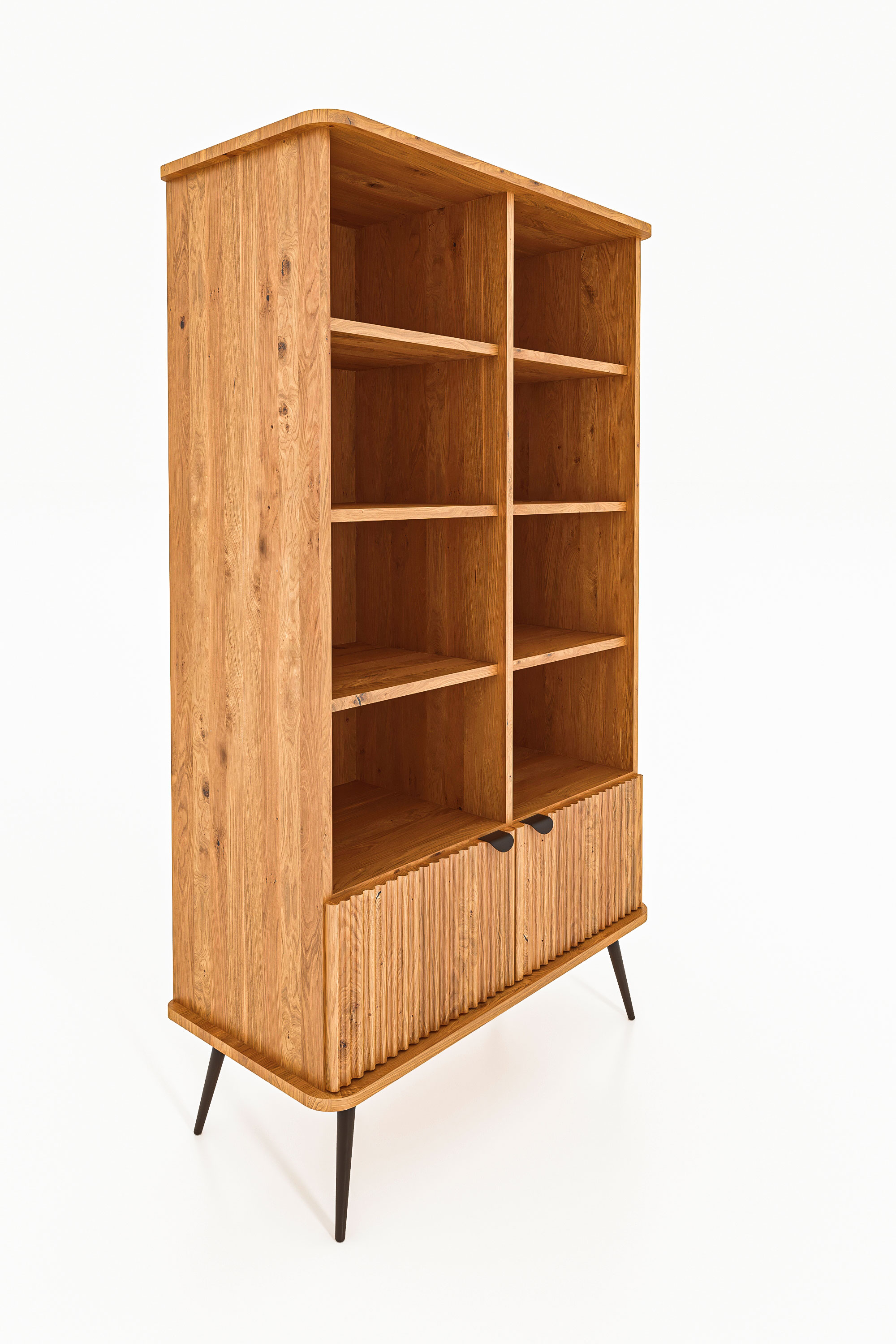 Dies ist das grösste und zugleich praktischste Möbelstück dieser Kollektion. Dank der schlanken, schwarzen Beine wirkt das Regal dennoch leicht und elegant. Es bietet reichlich Platz für Bücher, Dokumente, Dekorationen oder Bilderrahmen. Ideal für das Wohnzimmer, aber auch perfekt für das Arbeitszimmer. Hier gehen Funktionalität und Eleganz Hand in Hand – die gerillten Fronten verleihen dem Möbelstück einen einzigartigen und stilvollen Charakter.